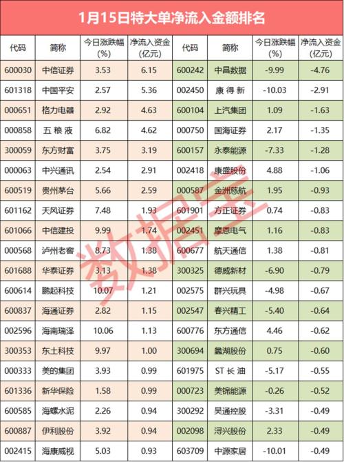 两市全天特大单净流入57.35亿元,其中15股特大单净流入超1亿元,中信证券(行情600030,诊股)特大单净流入6.15亿元,特大单净流入资金居首。三大股