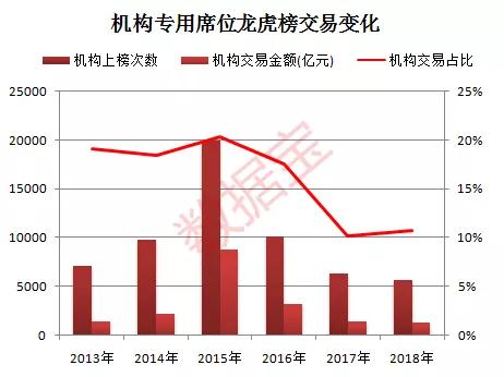 机构席位活跃度下降明显。去年,机构专用席位交易金额1260亿元,为近六年最低水平。与2015年峰值8761亿元相比,减少了7501亿元。机构专用席位去年上榜5601次,同步创下六年最低水平。