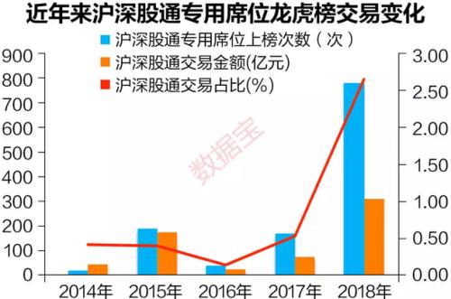 2018年龙虎榜席位中,沪深股通专用席位合计交易金额为316亿元,为沪深股通开通以来年度最高水平。同时,沪深股通专用席位上榜次数为历年最高,比2017年增长了3.52倍。此外,通过交易金额占比发现,2018年券商营业部占龙虎榜交易金额比例下降2.65%,沪深股通专用席位上升2个百分点。