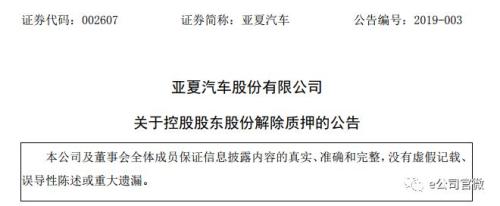 位于安徽的亚夏汽车也于近日收到公司控股股东安徽亚夏实业股份有限公司(以下简称“安徽亚夏”)函告,获悉安徽亚夏将其持有的本公司股份解除质押。截至公告披露日,安徽亚夏共持有公司股份15269万股,占公司总股本的18.61%。其所持有的公司股份没有被质押的情形。