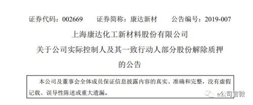 此外,地处上海的康达新材也10日晚间发布《关于公司实际控制人及其一致行动人部分股份解除质押》的公告,公司于2019年1月10日接到实际控制人陆企亭先生及其一致行动人徐洪珊先生、储文斌先生的通知,获悉陆企亭先生、徐洪珊先生、储文斌先生将其所持有的公司部分股票办理了解除质押手续。截至本公告日,陆企亭直接持有公司37,51万股股份,占公司总股本的15.56%,其所持有公司的股份累计被质押0 股;徐洪珊直接持有公司2699万股股份,占公司总股本的11.19%,所持有公司的股份累计被质押0股;储文斌直接持有公司12,59万股股份,占公司总股本的5.22%,其所持有公司的股份累计被质押0股。