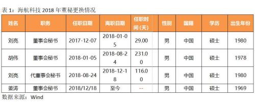 2018年,董秘的更换更加频繁。以海航科技为例,其董秘任期期限最短,在任时间仅29天。2017年12月7日至2018年1月5日,刘亮短暂担任了29天的董秘便告辞职。此后,1978年出生的胡伟被聘任为董秘,不足8个月后,他也宣布辞职,时任投资总监的刘亮再一次代行董秘职责。3个月后,姜涛被聘任为公司董事会秘书。资料显示,姜涛出生于1969年,曾任渤海国际商业保理股份有限公司董秘(表1)。