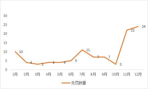 在离职的760位董秘中,104位在2018年因违规被证监会、上交所、深交所处罚,占离职董秘的比例为13.7%。从离职董秘受处罚的月份上看,11和12月公布的处罚数量较多,分别涉及22位和24位董秘, 这两个月受处罚的离职董秘占到了全年离职董秘数量近一半的比例(图2)。从处罚的时间来看,年底才是集中清算的时刻。