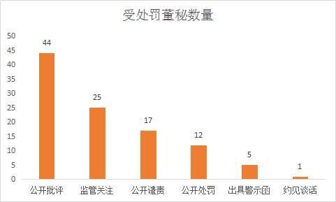 从处分类型看,受到公开批评处罚的董秘数量最多,为44位;受到监管关注处罚的有25位,公开谴责和公开处罚的分别为17和12位,另外,还有5位和1位分别受到出具警示函和约见谈话的处分(图3)。