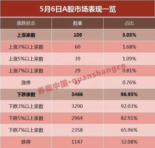 个股方面,全天共有3466只股票出现下跌,占比97%,其中跌幅超过7%的股票龚鸥2358只,占比达66%。两市仅109只出现上涨,占比3%。