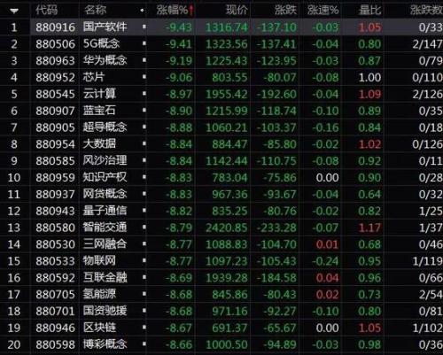 今日,两市各大行业板块全线尽墨,翻红个股仅100余只,国产软件、芯片、5G概念、芯片等科技股成杀跌重灾区,板块跌幅均超过9%,板块个股几乎全线跌停。