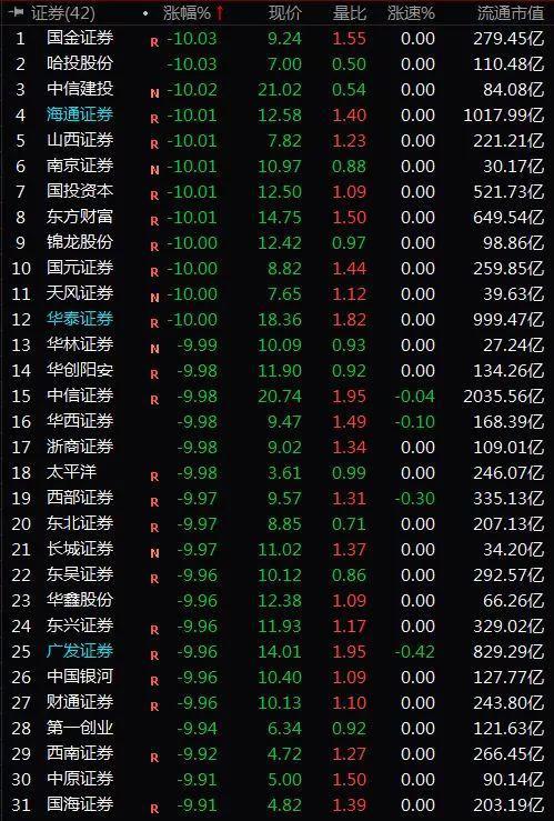 此外,券商板块指数大跌逾9%,国金证券(600109,诊股)、海通证券(600837,诊股)、中信建投(601066,诊股)、山西证券(002500,诊股)、南京证券(601990,诊股)等31只股票跌停。