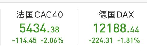 在亚太股市纷纷下挫后,欧洲股市也出现普跌。法国CAC40下跌2.06%,德国DAX下跌1.81%。