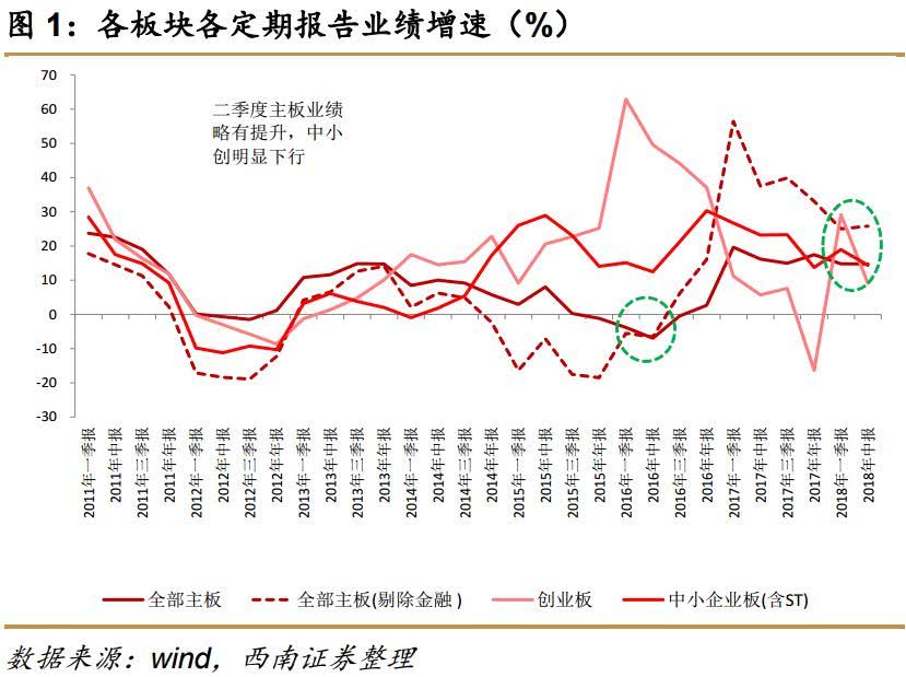西南证券研报分析称,A股业绩增速基本保持平稳,但板块分化明显。从单个季度的业绩增速来看,各板块波动更大,中小创业绩快速下滑。主板二季度业绩增速为16.2%,较一季度有明显提升。如果剔除金融板块,主板一季度业绩增速为25%,二季度为25.8%,从2017年四季度开始持续提升。而中小创的业绩则呈现大幅度波动。中小板业绩二季度单季增速降低到11.4%,而创业板业绩增速在二季度再次出现负增长,增速大幅回落到-6.30%,甚至明显低于此前业绩预告测算的-2.9%的增速。