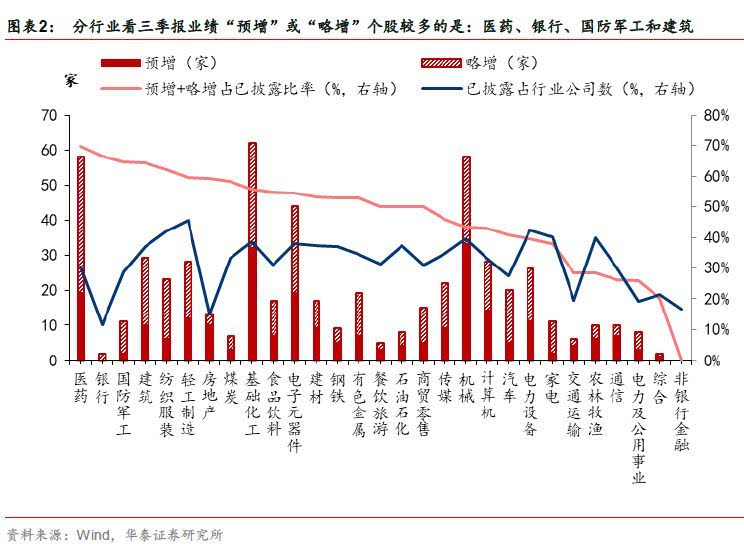 行业方面,医药、银行、国防军工、建筑等板块业绩“预增”或“略增”个股较多。华泰证券根据三季报业绩预警分析的结果显示,在各行业已披露三季报业绩预告的公司中,“预增+略增+续盈+扭亏”占比靠前的行业分别是:银行、纺织服装、建筑、煤炭、医药;而占比靠后的行业分别是:通信、农林牧渔、电力及公用事业、综合和非银行金融。单看业绩预增情况,占比靠前的行业分别是:房地产、餐饮旅游、钢铁、基础化工。
