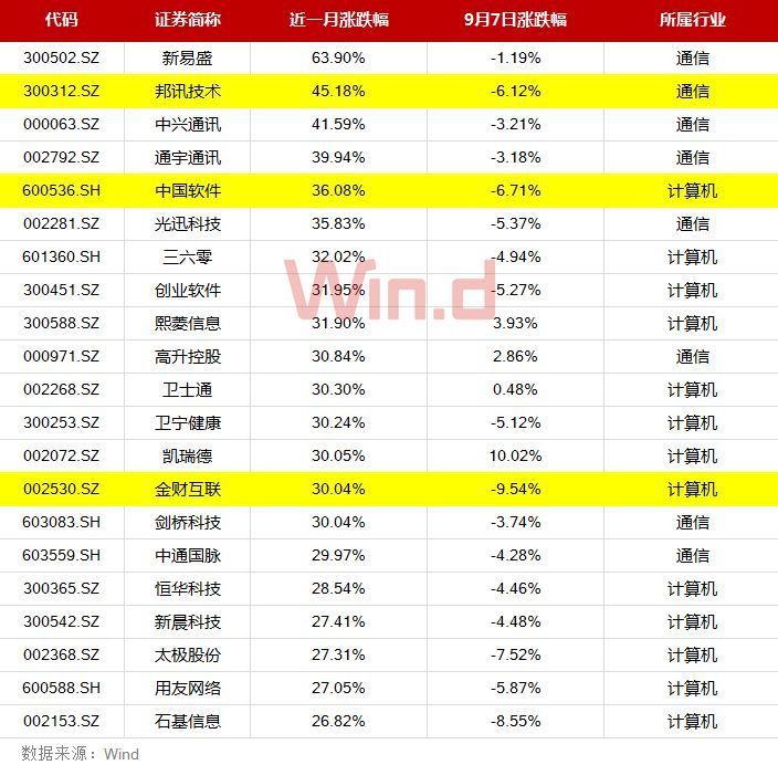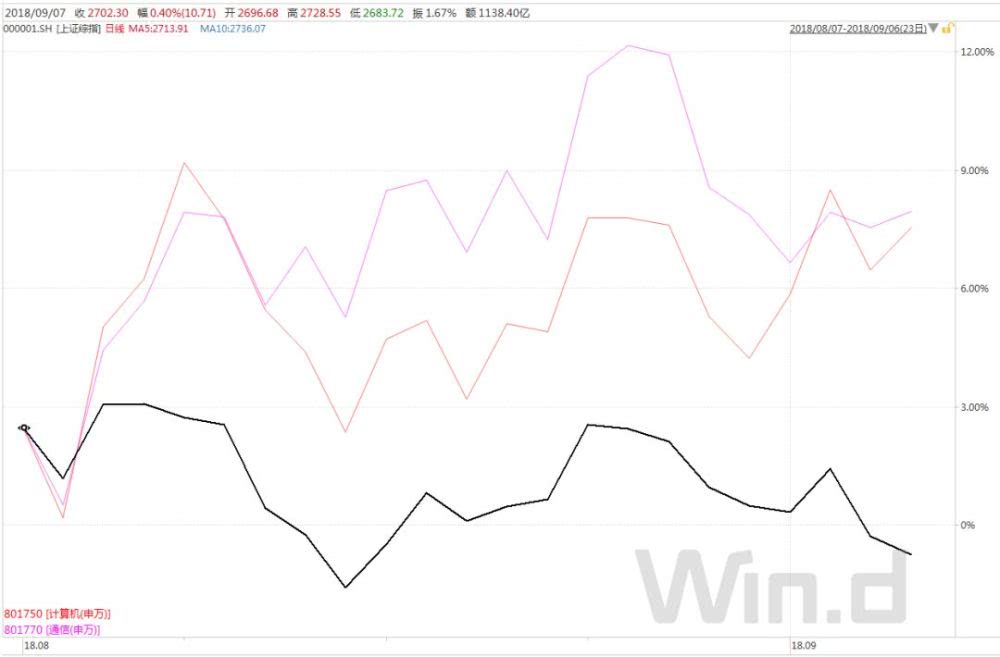 Wind数据显示,近一个月以来(8月7日~9月6日),万得全A指数累计下跌0.84%,上证综指累计跌0.5%,创业板跌1.24%,中小板跌0.84%。在此期间,计算机行业累计上涨7.35%,通信行业则上涨8.56%。