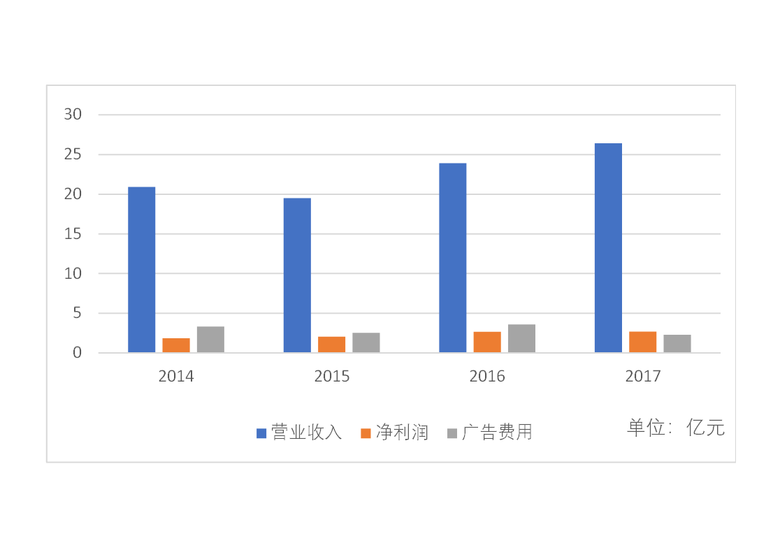 蓝鲸产经记者了解到,除了产品结构单一,营销费用占比高也是业内对于香飘飘的普遍质疑。据财报显示,香飘飘2018年上半年销售费用增长接近55%,从2017年同期的2.05亿增加到2018年上半年的3.17亿,其中,销售费用中广告费为1.14亿元,较2017年同期激增约78%。不仅如此,从往年业绩表现来看,从2014至2017年,香飘飘的净利润分别为1.85、2.04、2.66、2.68亿元,而其广告营销费用分别为3.33、2.53、3.59、2.3亿元。不难看出,同期的广告费用基本上接近或高于当期净利润。