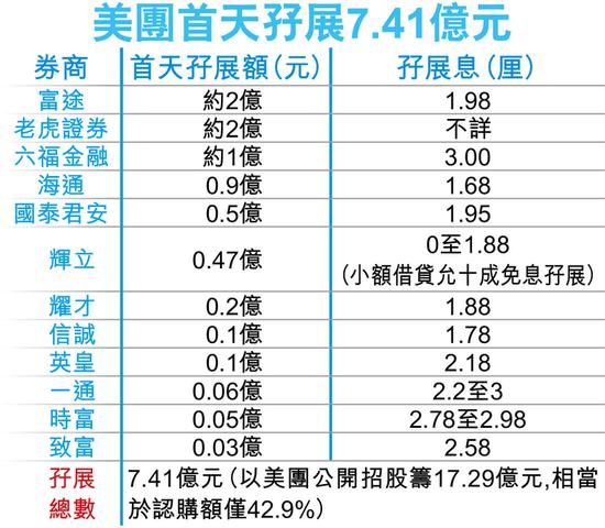 据香港经济日报报道,第二只同股不同权新股美团(新上市编号:03690)昨首日招股,券商合共借出逾7亿元孖展;以其公开招股集资17.29亿元计,相当于认购额的43%。华领医药定价 传下限8.28元美团暂未热,新经济股已接踵而至,外电消息指曾为多家新经济公司担任财务顾问的华兴资本,下周将进行预路演,寻求30亿美元(约234亿港元)估值,最多集资4亿美元(约31亿港元);高盛及工银国际为其联席保荐人。该股预期将于本月下旬上市。而第三家未录盈利生物科技公司华领医药(新上市编号:02552)将于下周五(14日)挂牌