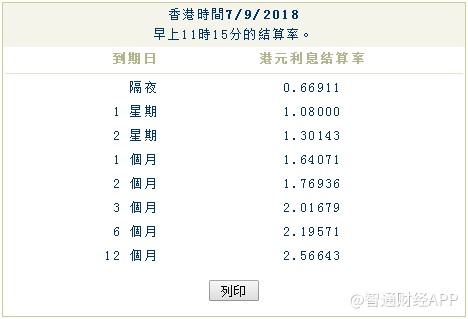 港元HIBOR全线下跌 离岸人民币隔夜HIBOR创80天新高