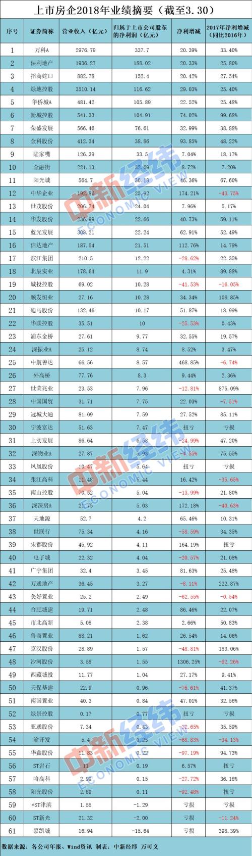 据Wind数据显示,截至3月30日,按照申万行业分类,在A股上市的129家房企中已有61家披露了2018年年报或业绩快报,其中58家盈利,占比超九成。A股上