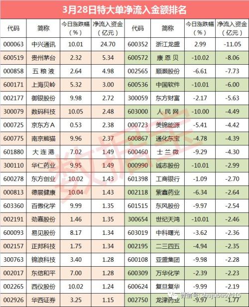 两市全天特大单净流出149.12亿元,其中8股特大单净流入超2亿元,中兴通讯(行情000063,诊股)特大单净流入24.70亿元,特大单净流入资金居首。沪指