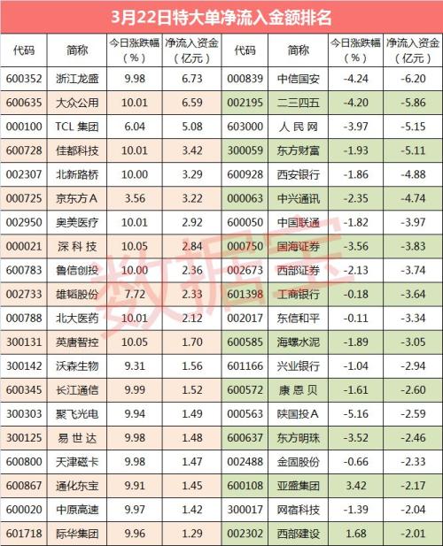 两市全天特大单净流出178.65亿元,其中11股特大单净流入超2亿元,浙江龙盛(行情600352,诊股)特大单净流入6.73亿元,特大单净流入资金居首。周五