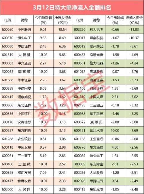 两市全天特大单净流出75.82亿元,其中24股特大单净流入超2亿元,中国联通(行情600050,诊股)特大单净流入18.54亿元,特大单净流入资金居首。周二