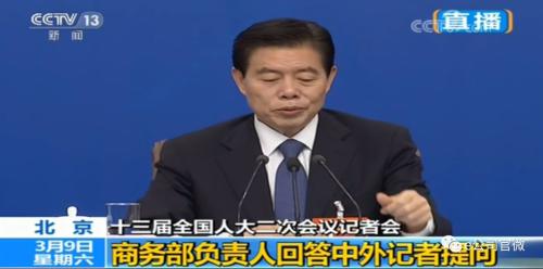 十三届全国人大二次会议新闻中心举行记者会,邀请商务部部长钟山、副部长兼国际贸易谈判副代表王受文、副部长钱克明就“促进形成强大国内市场推动全方位对外开放”相关
