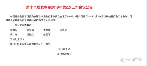 新一届21人发审委将正式亮相,猪年首场发审会敲定。来自四川的天味食品将接受新一届发审会“登堂提审”。证监会3月8日晚披露,第十八届发行审核委员会定于3月12