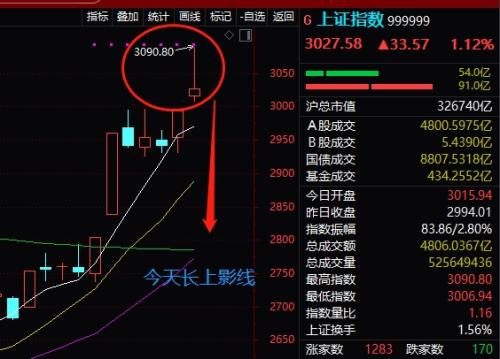 沪指在今天直接高开站上3000点,盘中还一度涨逾3%,最高涨至3090.80点。虽然午后震荡回落,最终仍收报于3027.58点,沪深两市合计成交再破万亿元。