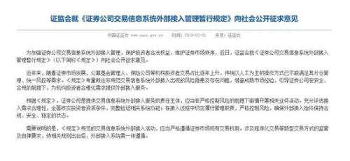 备受关注的证券公司交易信息系统外部接入有了新进展!2月1日,证监会就《证券公司交易信息系统外部接入管理暂行规定》(以下简称《规定》(征求意见稿))向社会公开