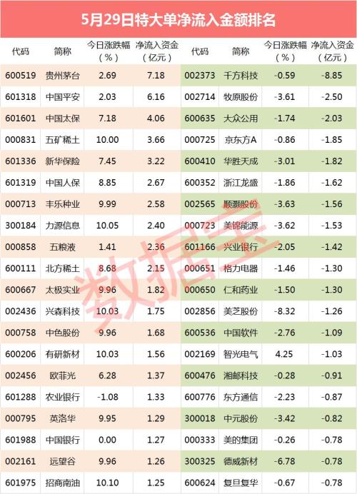 贵州茅台(行情600519,诊股)周三蝉联特大单流入第一的位置,全天特大单净流入7.18亿元。稀土股、保险股特大单流入居前。A股三大股指周三收盘涨跌互现,沪