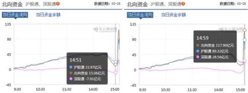5月28日讯,大量北上资金尾盘驰援A股,到底发生了啥?截至14:55,北上资金当日净流入14.74亿元,而到了14:59,北上资金当日净流入金额却高达117