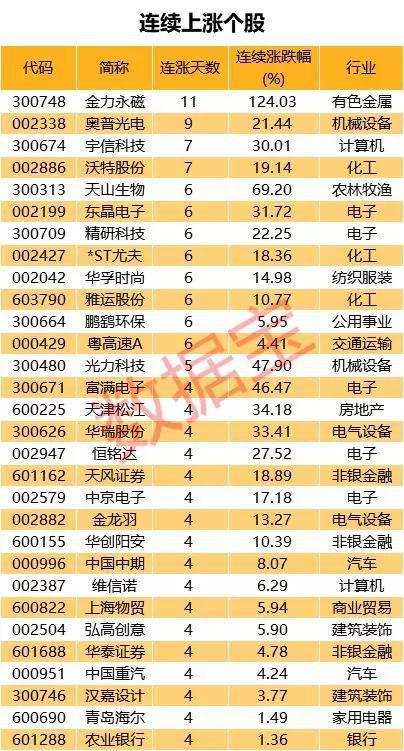 震荡行情中,两市有30只个股连续上涨超4天,其中最牛股金力永磁(行情300748,诊股)连涨11天。大盘自4月22日以来陡然降温,走出向下调整行情,截止最新