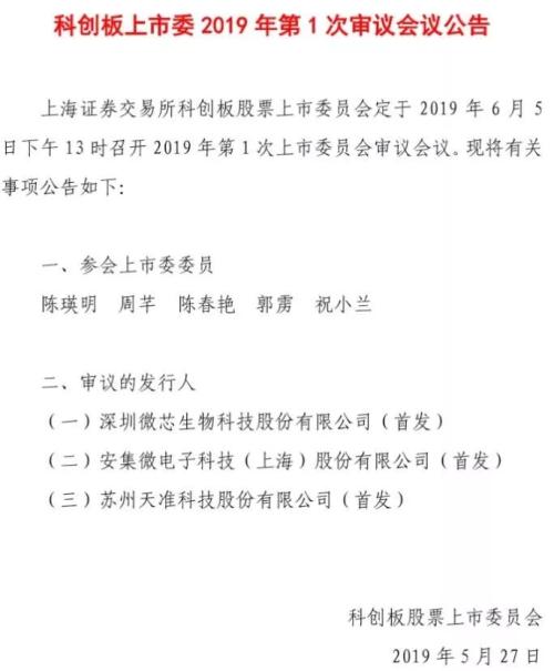5月27日盘后,上海证券交易所宣布将于6月5日召开科创板发审委第一次会议。苏州天准科技股份有限公司、安集微电子科技、深圳微芯生物科技股份有限公司将参与首次审