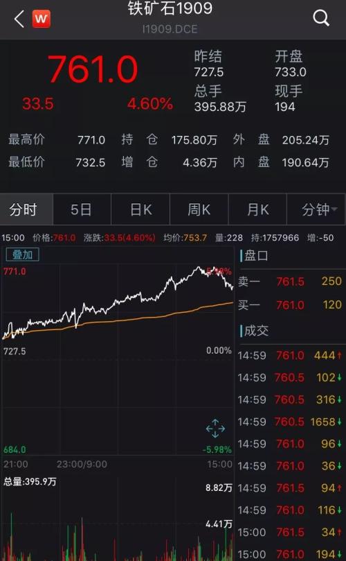 铁矿石期货大涨! 5月27日盘中,铁矿石主力合约盘中一度涨停,续刷五年新高至771元/吨。截至收盘,铁矿石涨4.6%,领涨商品市场。年内涨超50%在经过了1