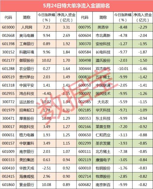 沪深两市全天特大单净流出超35亿元,申万28个一级行业仅9个行业特大单净流入,电子行业特大单净流出居首位。11只个股特大单净流出超亿元,16只个股特大单净流