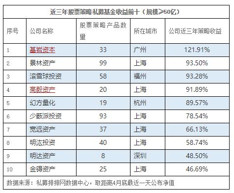 2019年5月20日,私募排排网不同规模私募机构十强榜单重磅发布。在规模大于等于50亿的近三年股票策略私募基金收益榜单中,基岩资本、景林资产、滚雪球投资,分