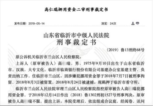 日前,山东这家城商行发生了一起银行员工挪用公款的事件。 5月14日,券商中国记者注意到裁判文书网公布了一则刑事判定书,原临沂市临商银行基建办公室基建主管高某