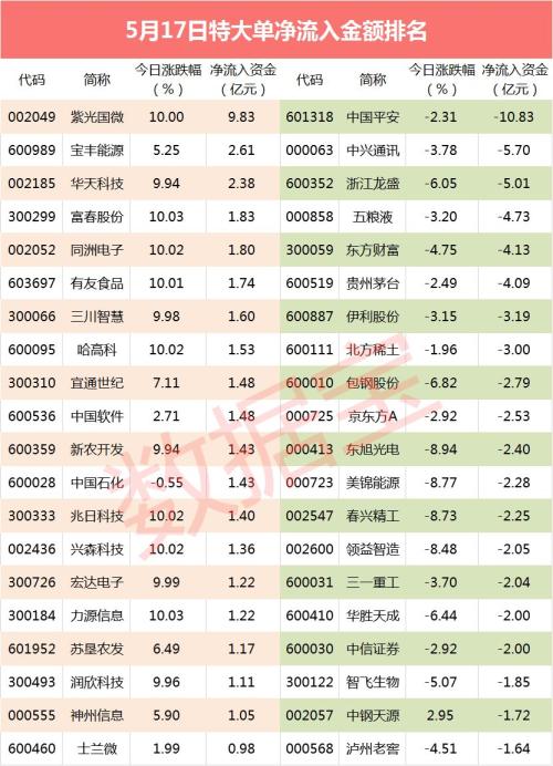 沪深两市全天特大单净流出217.59亿元,申万28个一级行业全部特大单净流出,非银金融特大单净流出居首位。52只个股特大单净流出超亿元,19只个股特大单净流