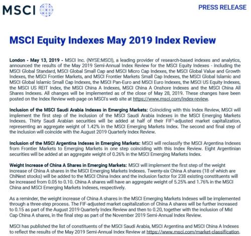 A股迎来了MSCI如期首轮扩容调整。北京时间5月14日早间,明晟指数公司公布了MSCI股票指数2019年5月半年度指数评估结果,中国A股权在MSCI 新兴市