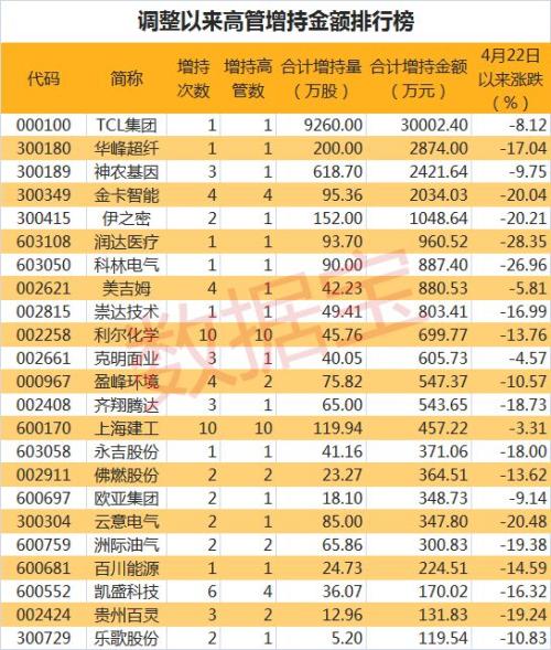 近期沪指调整态势下高管增持相对频繁,期间共有45家公司股份获高管增持,其中5家公司高管增持金额超千万元,最高增持3亿元。本轮沪指快速调整始于4月22日,调整