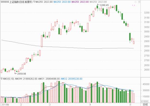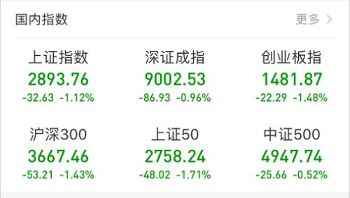 下跌势头还没扭转。外围市场动荡,A股今日大幅低开,上证指数低开1.82%,开盘后一路走高翻红,然而冲高未遂,午后又一路下跌,最终收跌1.12%,报收2893
