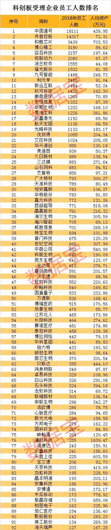 92家科创板受理企业2018年员工人数合计9.62万人,21家公司员工人数超过1000人。 随着博拉网络、白山科技的首次登台亮相,科创板受理企业扩大至92家
