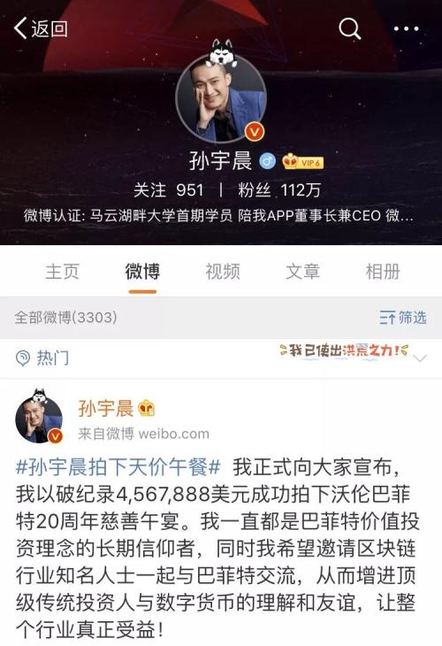 巴菲特午餐史上最高价竞拍人揭晓。6月4日,区块链公司波场的始人孙宇晨在微博和推特上宣布以4567888美元(约折合3153万元人民币)拍下了巴菲特午餐。这位