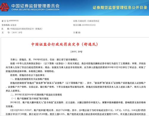 3月25日,中国证监会发布了对舒逸民的行政处罚决定书,合计对舒逸民没收违法所得2293万元,并处以2393万元的罚款。舒逸民作为“三剑客”之一,在股市上曾和