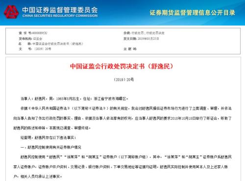 4月2日,证监会发布对知名牛散舒逸民的行政处罚决定书!证监会决定对舒逸民操纵“浩丰科技(行情300419,诊股)”“南华仪器(行情300417,诊股)”“中