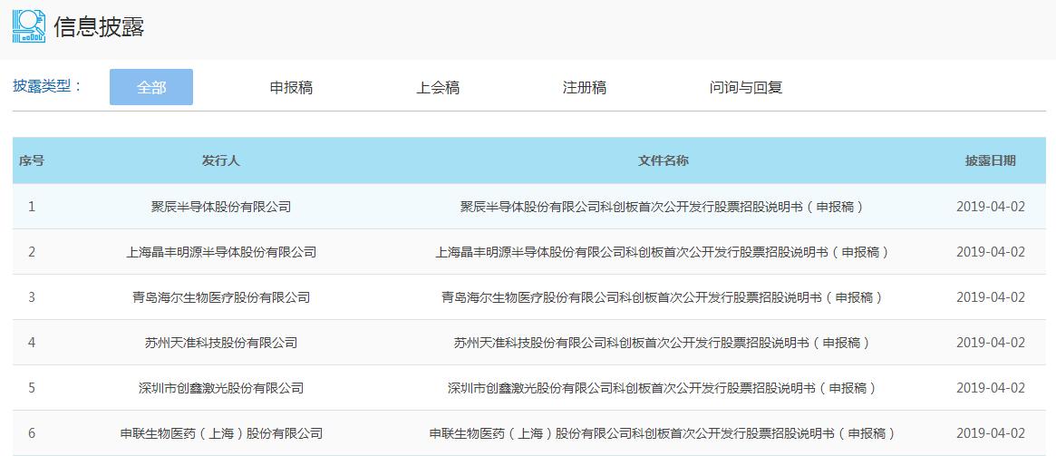 上交所4月2日披露新受理科创板上市企业名单,分别为深圳市创鑫激光股份有限公司、申联生物医药(上海)股份有限公司、苏州天准科技股份有限公司、青岛海尔(行情60