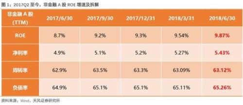 摘要 1、为何ROE能连续8个季度提升,甚至未来还能维持在高位?但A股市场却早早开始下跌? 2、结合中报的数据,再次展示一个“以企业部门流动性”为核心变量的研究框架——目前的形势是否有所改善? 3、创业板三季报的业绩历来没什么好的办法自上而下预测,这里我们试图采用一个相对理性的办法。 几个独特的视角再看中报和当前市场 1、为何ROE能连续8个季度提升,甚至未来还能维持在高位?但A股市场却早早开始下跌? 18年Q2非金融A股TTM ROE达到9.87%,连续8个季度提升。具体拆解来看:(1)