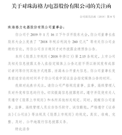 本所《股票上市规则(2018年修订)》第2.15条规定,上市公司及相关信息披露义务人在指定媒体上公告之前不得以新闻发布或答记者问等任何其他方式透露、泄漏未公开重大信息。问询函还称,格力董事长发表前述言论的时间早于公司在中国证监会指定媒体公告的时间。