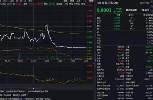 值得注意的是,除了50ETF购2月2800期权外,当日大涨104倍的50ETF购2月2750期权,27日收盘大跌99.29%,因为收盘50ETF现货价格低于2750,所以买入2750看涨期权也变得一文不值,价格变成0。