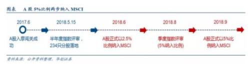 2018年6月1日,A股正式以纳入2.5%比例纳入MSCI;9月A股正式以5%的比例纳入MSCI。