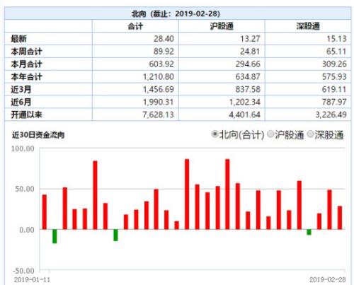 从去年12月底开始,外资就在持续净流入,而到了2019年初资金流入呈现加速趋势。截至2月28日,今年以来,北上资金通过沪股通和深股通,已经持续流入1210.80亿元,其中沪股通今年流入634.87亿元,深股通今年流入575.93亿元。单单2月份就流入了603.92亿元。可见外资从去年底到今年初一直在买入A股。