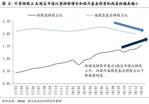 从外资持股市值占A股总市值的比重看,虽然整体目前仍是不到2%的水平,但该比例持续上升,说明外资持续布局 A 股的思路始终没变,其在 A 股市场上的“话语权” 也是与日俱增。如果我们只看主动型偏股基金的仓位,按照这个趋势,2019 年外资持股占比很可能会与国内机构势均力敌。