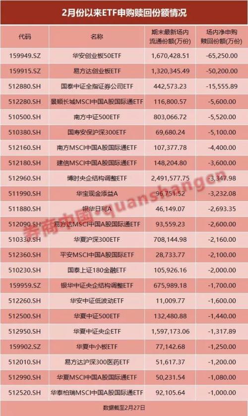 然而在创业板大涨期间,两大创业板ETF却呈现大额净赎回。数据显示,2月1日-2月27日期间,华安创业板50ETF被净赎回6.525亿份,易方达创业板ETF被净赎回5.02亿份。